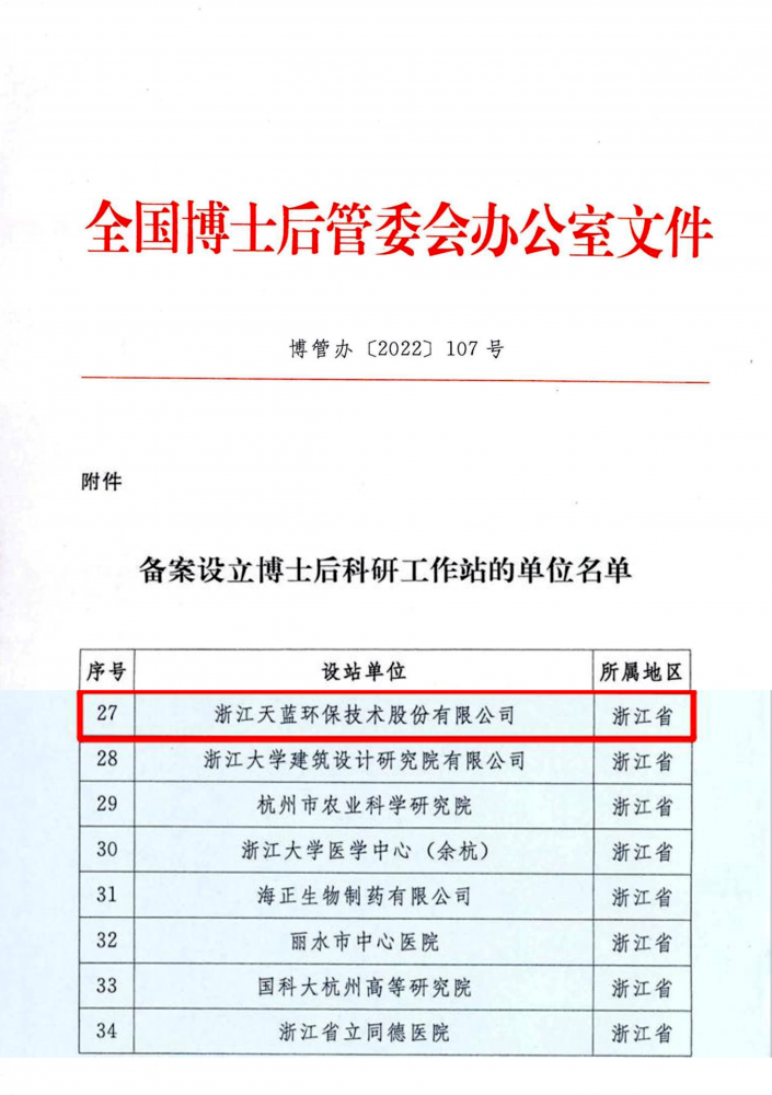浙江天藍環(huán)保技術股份有限公司獲批國家級博士后工作站,標志著天藍環(huán)保在人才隊伍、技術創(chuàng)新和科研平臺建設上的重大突破。