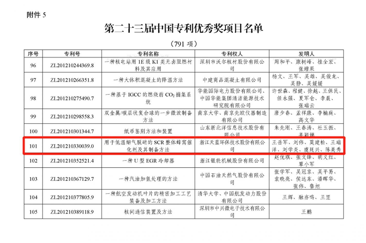 在剛剛揭曉的第二十三屆中國專利獎中,我司發(fā)明專利“用于低溫煙氣脫硝的SCR整體蜂窩催化劑及其制備方法”榮獲中國專利獎優(yōu)秀獎。